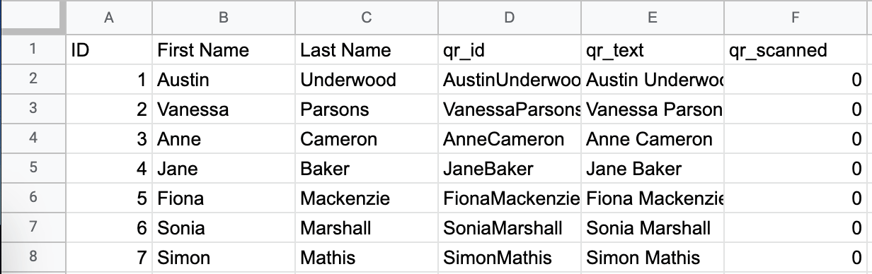 The QR Explore Scanner uses a Google Sheet as the basis for scanning. The initial data is used to determine which codes are valid, then when codes are scanned a scanned column is updated.